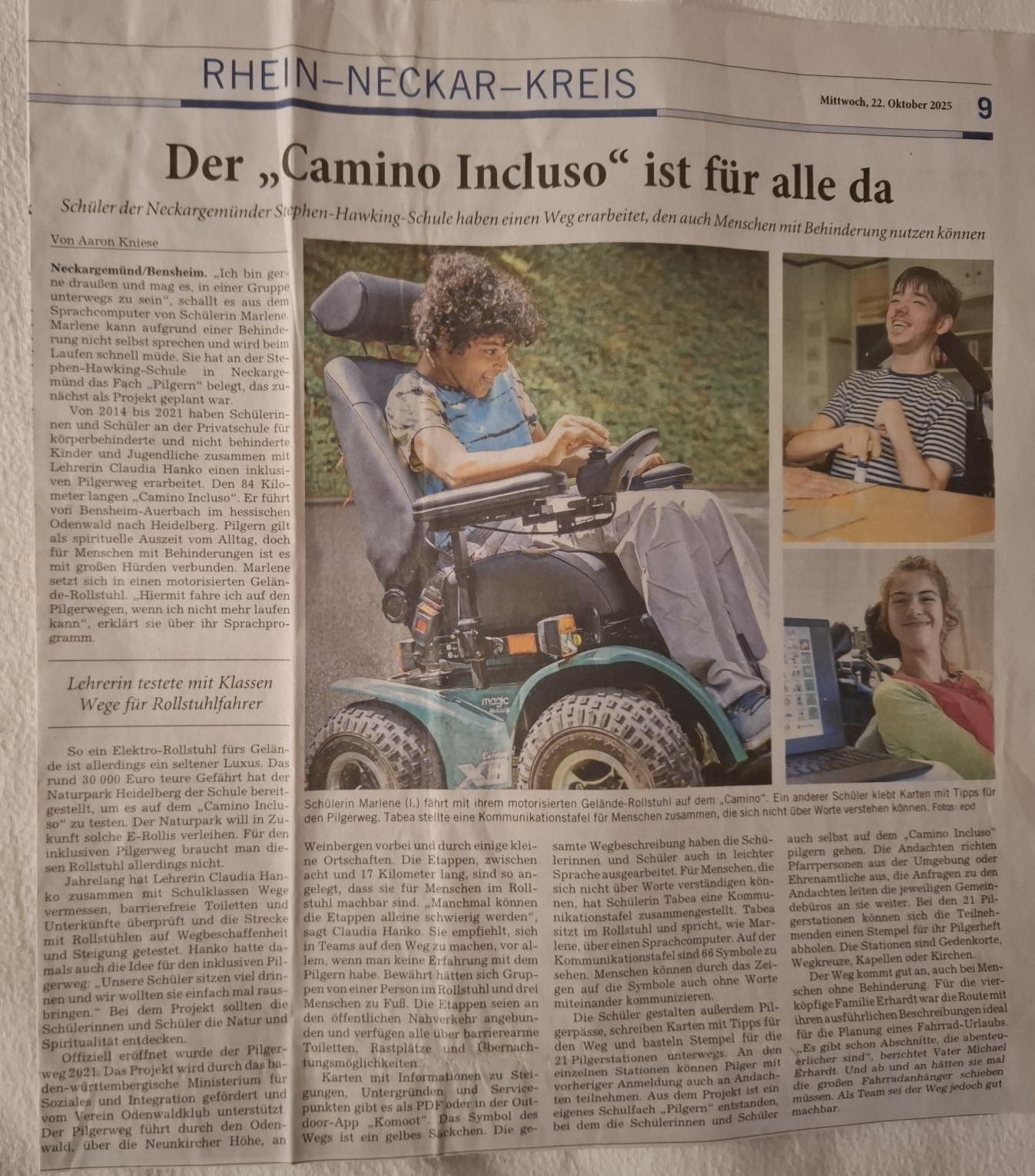 „Von 2014 bis 2021 haben Schülerinnen und Schüler an der Privatschule für körperbehinderte und nicht behinderte Kinder und Jugendliche zusammen mit Lehrerin Claudia Hanko einen inklusiven Pilgerweg erarbeitet, den 84 Kilometer langen „Camino Incluso“.